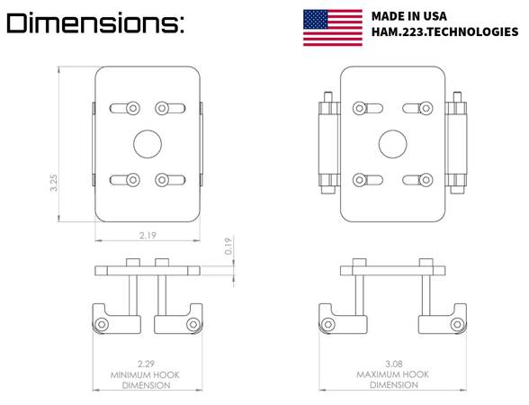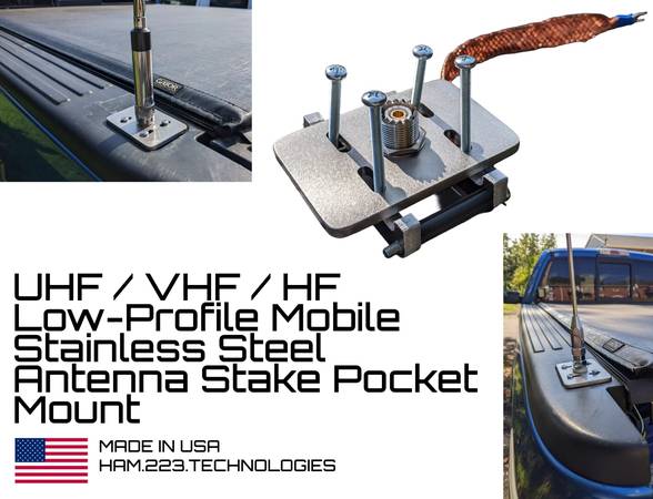 This is a no-drill, Adjustable HAM / CB radio antenna mount that mounts to most all truck stake pockets. See dimensions for mounting configurations. There are usually 4X stake pockets on most American truck beds, as shown in the images. The plate material is 316 Stainless Steel with 4x M4 x 0.7 steel screws (2" long) and is very robust. The hooks are bare 5052 aluminum, with two black PLA spacers in between. This will not rust like untreated steel will. This mounts to several different types of trucks with different sized stake pockets.