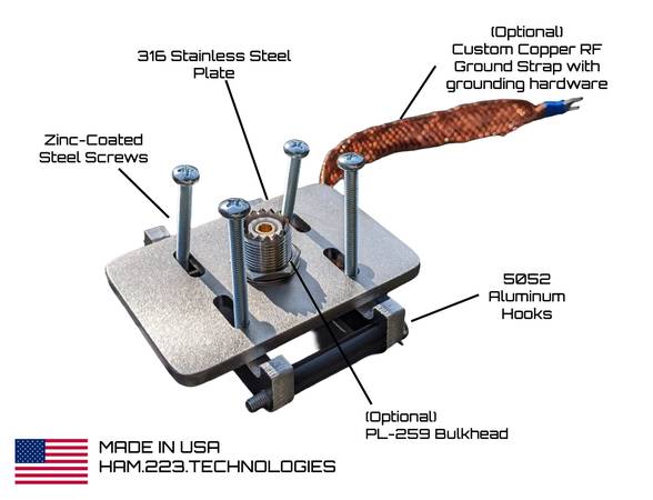 (1x) 316 Stainless Steel Mount + (1x) PL-259 Bulkhead Connector + (1x) Enhanced RF Ground Plane Kit. The complete kit. Everything needed to have a good RF ground plane and drop-in mounting. SO-239 connector comes pre-installed and pre-torqued. (~10” RF copper ground cable allows residual RF energy to flow across surface to vehicle ground)