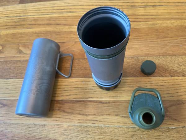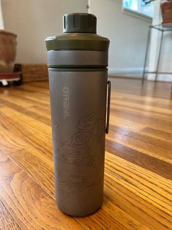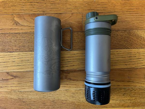 Awesome on-demand water filtration. This one has Never been used but has a couple of marks from riding in a pack once or twice. Titanium cup can be used over a fire to boil water and it can filter...