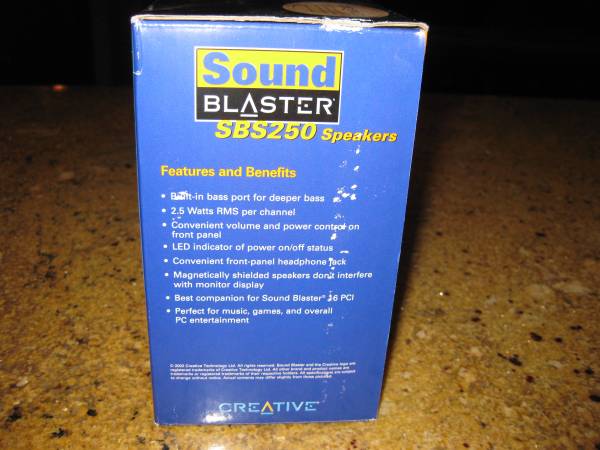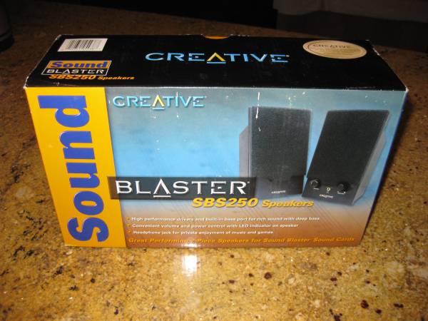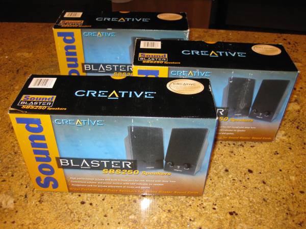 These are new, never-used, still-in-the-factory-carton Sound Blaster SBS250 speakers. The box contains 2 speakers and a power adapter. I have 3 of these sets, all new: $20 per set, all 3 sets for $50.