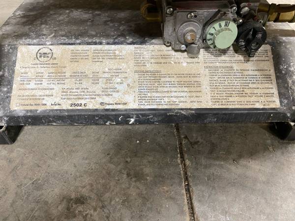 (1) Top-hat propane 500,000 BTU heater with 20lb propane tank. No power required; radiant heat. Works great. $225