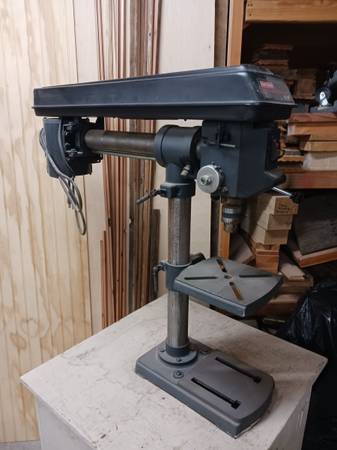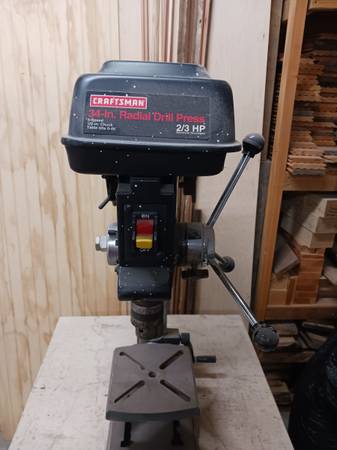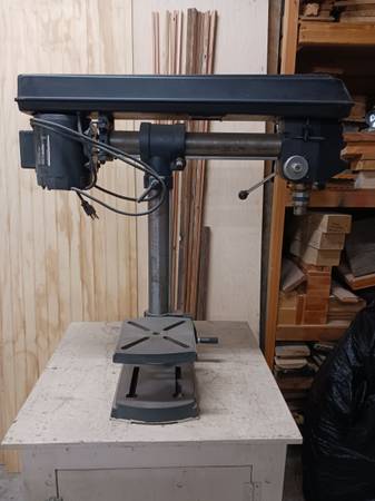 Bought new in 2003', everything works like new. Used for stairway railings and cabinet door hingesfor the most part. Don't use a lot and wanting to clear space. Comes with a drill table and cabinet...