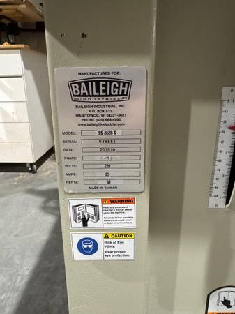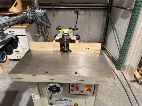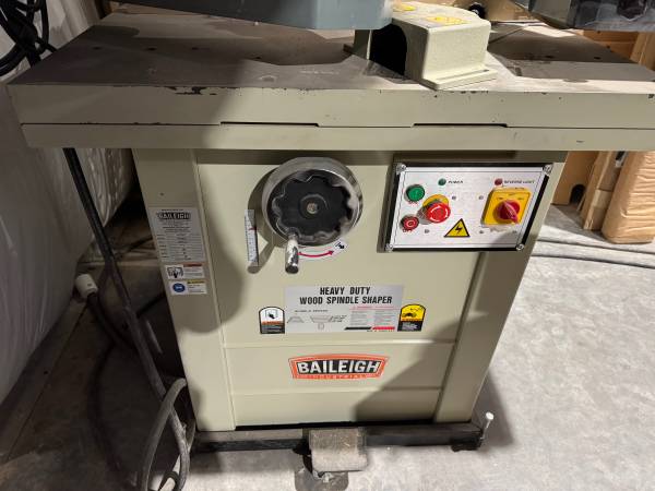 Baileigh Shaper in excellent shape. Has three quick change shafts 3/4" - 1" - 1 1/4". Single phase. On a movable base cart so you can push it around your shop. Table slotted for power feed. We have one extra delta power feed that can come with it if it doesn't sell with one of the other two shapers we have for sell. Ready to go, can plug in and demo for serious buyers. Forklift available during business hours monday-thursday. Versatile machine good for any shop.