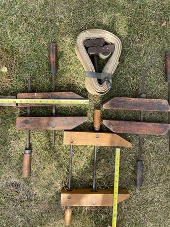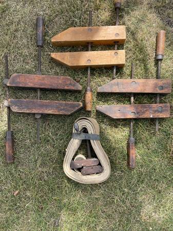 2” x 10’ Canvas band. Wooden adjustable clamp 6” depth and 12” spread. Both styles are vintage except one is not vintage. $20 each.