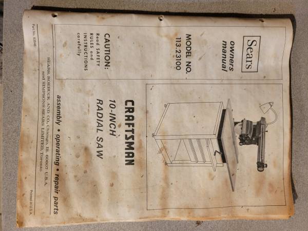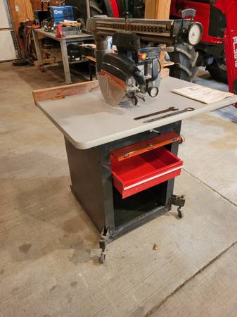 Craftsman 10 inch radial arm saw. Cabinet with sliding drawer, blade removal tools, and owners manual
