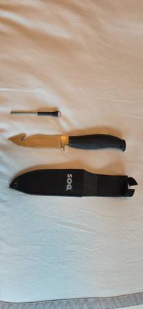 It has a razor sharp edge and gut hook, even after skinning an entire elk! The entire knife feels sturdy and solid; designed to take a beating while putting it to work. The ergonomic handle is very comfortable in hand. There is a knife sharpener built into the handle and comes with the black sheath.