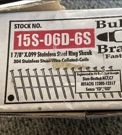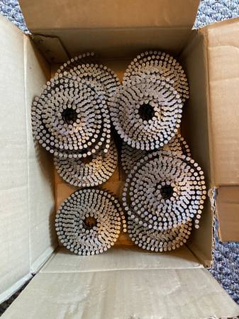 Not sure the exact quantity, best guess is 2,500-2,700 stainless steel ring shank nails. $25 for what's remaining in the box (9 coils - see photo).