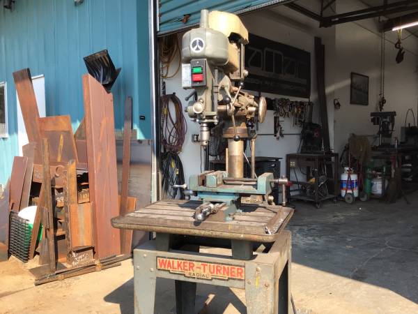 1942 Walker Turner Radial drill press. The head swings, slides, rotates and swivels. I’ll sell the machinists’ vice as well for another $200.