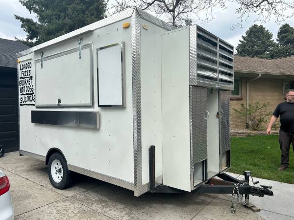 12 ft food trailer, FUD trailer built in 2021 only used about 9 months since then equipment like new. Has heat and air conditioning. Generator not included.