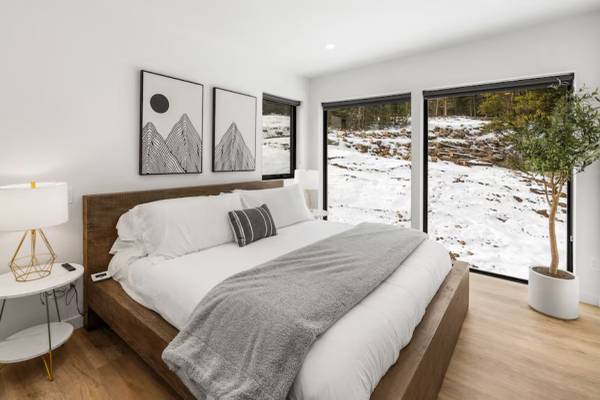 The cabin includes a fully equipped kitchen with a convection oven and Ninja slow cooker, a fire pit for evenings under the stars, and snow removal for easy access all winter.