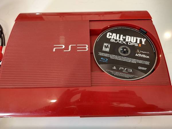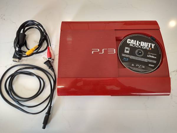 The sale includes the Red PS3 Slim System, Power Cable, TV Connection cable, and a disk for Call of Duty Black Ops II! The system will also be factory reset before purchase.